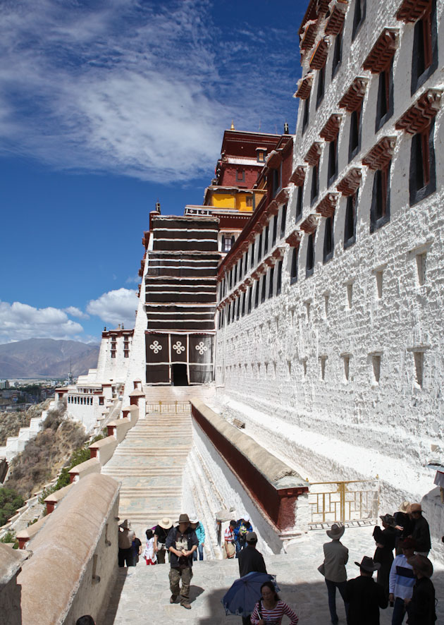 Từ đây ngước nhìn lên, cung Potala cao vời vợi … chỉ vài trăm bậc đá nữa là tới được cửa vào Bạch Cung; mới nghe tưởng dễ dàng nhưng có leo từng bậc Potala mới thấy cái khắc nghiệt của thời tiết Lhasa; trong điều kiện không khí loãng bằng 68% mức thông thường, ở độ cao hơn 3600m, du khách ai cũng thở khò khè trong gió khan và nắng cháy, lại không được quên chụp ảnh xung quanh…