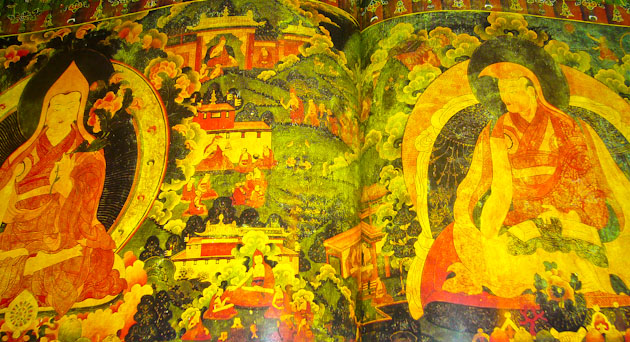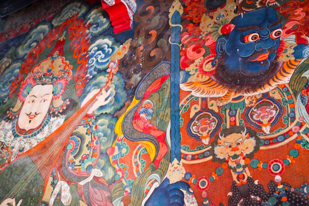 Hai bên cổng là mural của Tứ Đại Thiên Vương (Four Guardian Kings), được xem là tứ tướng hộ pháp của Đại thừa Mật tông. Vị mặt vàng là Bắc Vương Đa Văn Thiên tay cầm lọng, vị mặt đỏ là Tây Vương Quảng Mục Thiên tay cầm stupa, vị mặt xanh là Nam Vương Tăng Trưởng Thiên tay cầm kiếm, và vị mặt trắng là Đông Vương Trì Quốc Thiên tay cầm đàn. Những bức hoạ hình này là những mural lớn nhất, đẹp nhất, và chi tiết nhất về bốn Thiên Vương