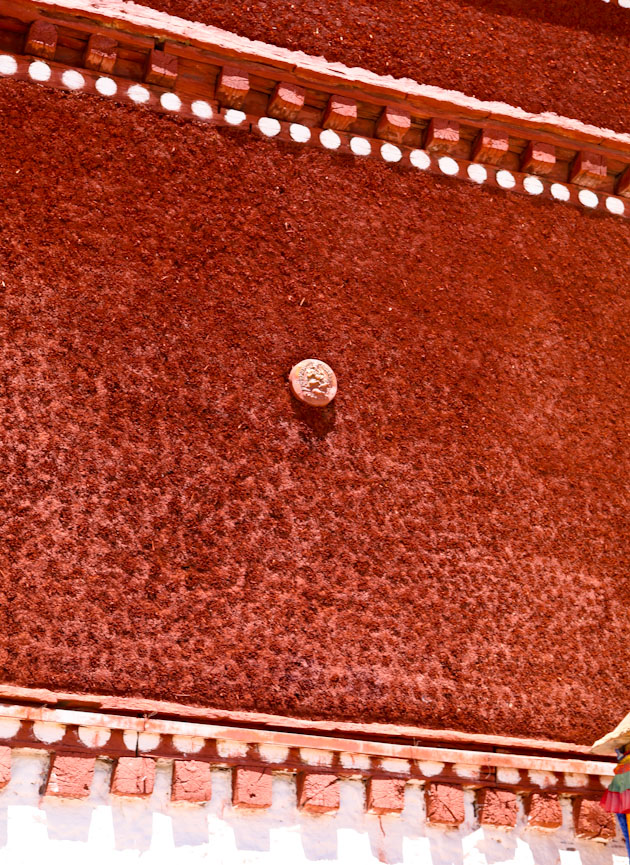 - Ảnh là đỉnh mái vàng (Golden Dome) của Stupa lớn chứa thi hài Đạt Lai Lạt Ma thứ 13, xây năm 1936. Kiến trúc mái vòm Potala được trang trí đầu chim thần garuda, bên dưới mái là kết cấu ngàm đỡ nhiều tầng vô cùng chắc chắn, đảm bảo vòm chịu được chấn động và gió lớn: