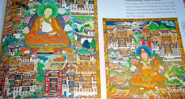 Ra đến ngoài cửa sau của Hồng Cung, khách du lịch ai cũng thấy hụt hẫng! Nội cung chiến thành vĩ đại của người Tạng đó sao? Cung điện mùa đông của Đạt Lai Lạt Ma chỉ là nhiêu đó? Có lẽ do chủ ý của Trung Quốc làm khách thăm quan không ai chiêm ngưỡng được vẻ đẹp quý báu thực sự của Potala: hàng người này đến hàng người khác xô đẩy luồn lách trong những hành lang nhỏ tối om om; giọng hướng dẫn viên oang oang vẳng vào từng góc nhỏ; những căn phòng đóng cửa, những ổ khoá im lìm, camera bí mật bố trí ở tất cả các cửa ra vào; ánh sáng vàng vọt le lói trên cao không đủ soi tỏ bệ thờ, những pho tượng nghìn tuổi được khoá sau những hàng rào gỗ cao quá đầu người, những tấm thangka và tranh tường khuất sau lưới sắt, những mandala 3D cất trong tủ kính mờ, những câu kinh Phạn-Tạng cuộn thành từng gói nằm phủ bụi trên kệ; những tấm biển chú thích sơ sài dưới chân những Stupa vàng ròng cực lớn … Người ta không cảm thấy được sự thâm nghiêm và cao quý của nơi đây, cái hồn xưa cũ của Potala dường như đi vắng!Chúng tôi may mắn trong lúc sắp rời khỏi Hồng Cung đã kịp mua cuốn sách The Potala của Unesco, ấn bản 1993 giá 160RMB, dành riêng để giới thiệu về cung. Cuốn sách này không bán ở bất cứ đâu ngoài khu vực cung Potala! sau khi mua, cuốn sách được đóng một triện màu đỏ 3 thứ tiếng Anh-Tạng-Trung: A Souvenir of the Potala Palace. Sách dày 165 trang, tất cả đều in màu chụp lại toàn bộ các điểm nhấn kiến trúc của Potala, các điện thờ quan trọng của Hồng Cung và Bạch Cung, những Stupa chính cùng các pho tượng Phật quý giá cất bên trong cung, kiến trúc mái vòm kinh điển của cung … Đây là 1 tài liệu tham khảo cực kỳ quý giá để khách phương xa hiểu được những giá trị văn hoá và thấy hết vẻ đẹp mà cung Potala sở hữu. Xin được giới thiệu với bạn đọc một số hình ảnh chụp lại từ sách, những hình ảnh này hầu như chưa xuất hiện trên mạng, và kể cả có đi thăm Potala ngày nay chắc cũng khó lòng mà mục kích được:- Bên trái là cổng tiền sảnh Bạch Cung, bên phải là cổng tiền sảnh Hồng Cung: