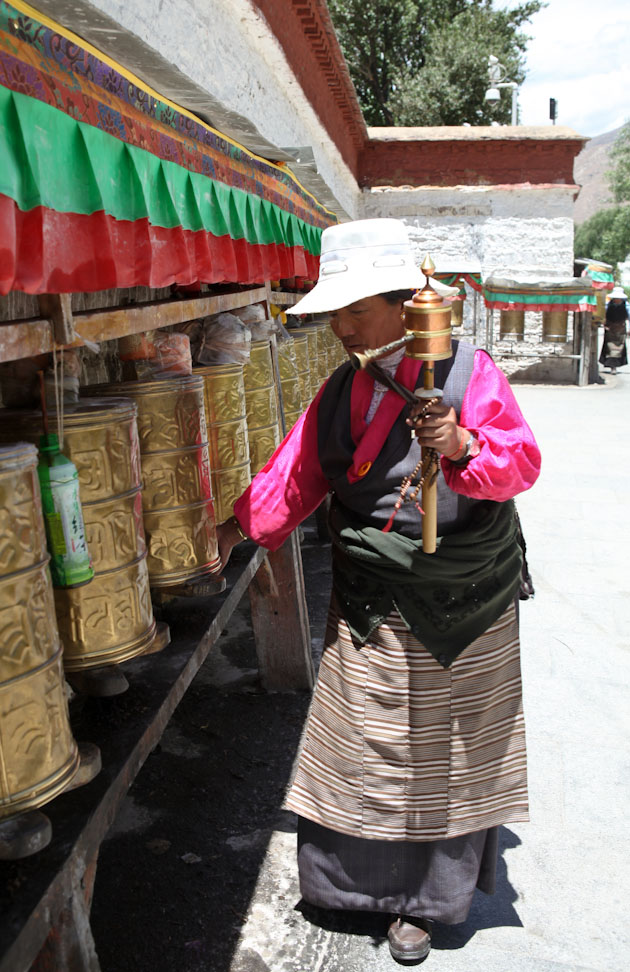 Con đường này đẹp tuyệt vời! hàng trăm chiếc kinh luân màu đồng óng ả in nổi câu kinh Om Mani Padme Hum xếp dọc theo tường, chốc chốc lại có người đi tra dầu bôi trơn cho từng chiếc, những đoàn người Tạng vừa đi vừa đẩy kinh luân xoay theo chiều kim đồng hồ giữa cái nắng trưa oi ả. Ở đây, người viết gặp nhiều người Tạng hơn cả, khác với bên trong cung điện Potala đa phần là khách thập phương: